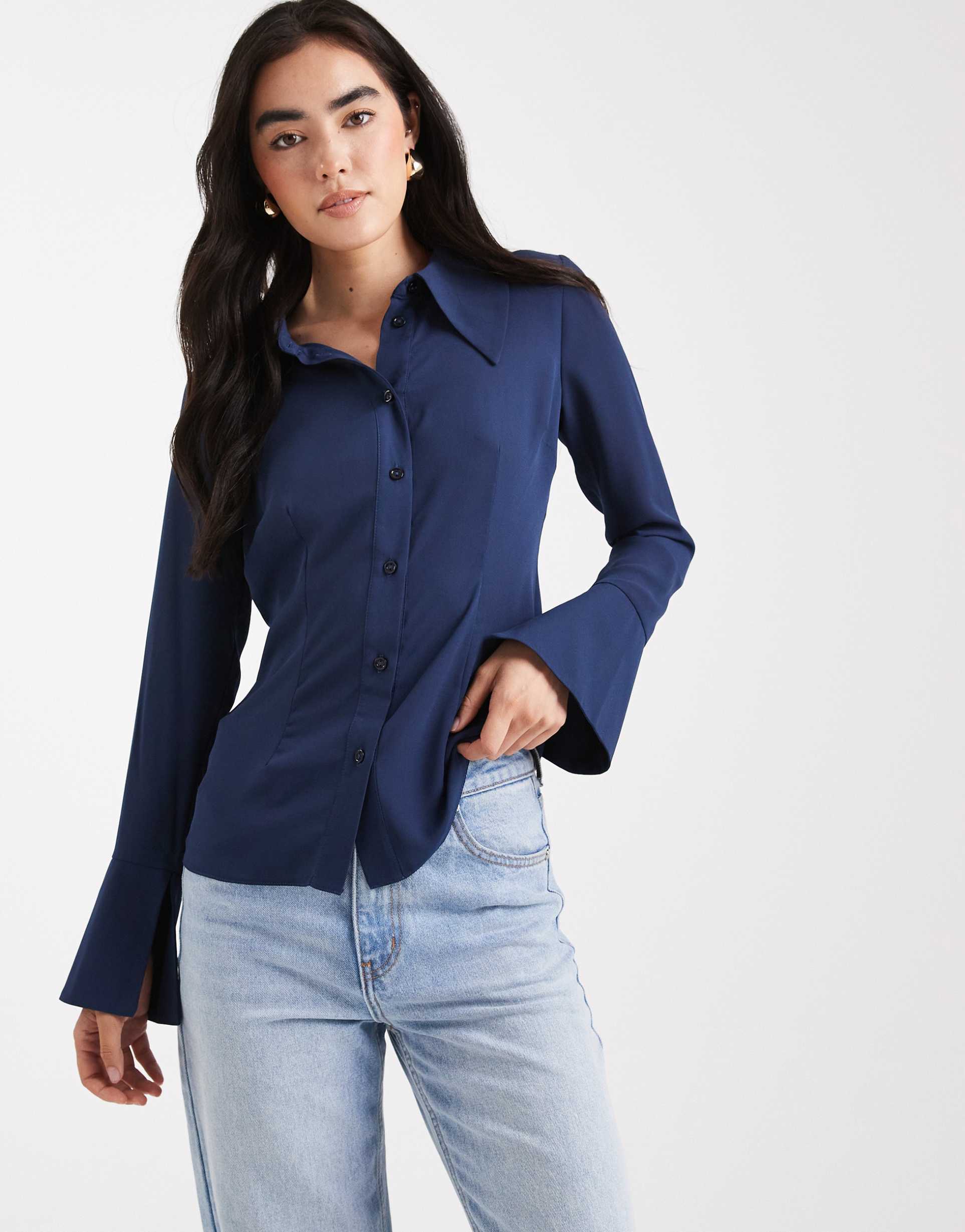 ASOS DESIGN EXAGGERATED COLLAR AND CUFF SHIRT IN NAVY