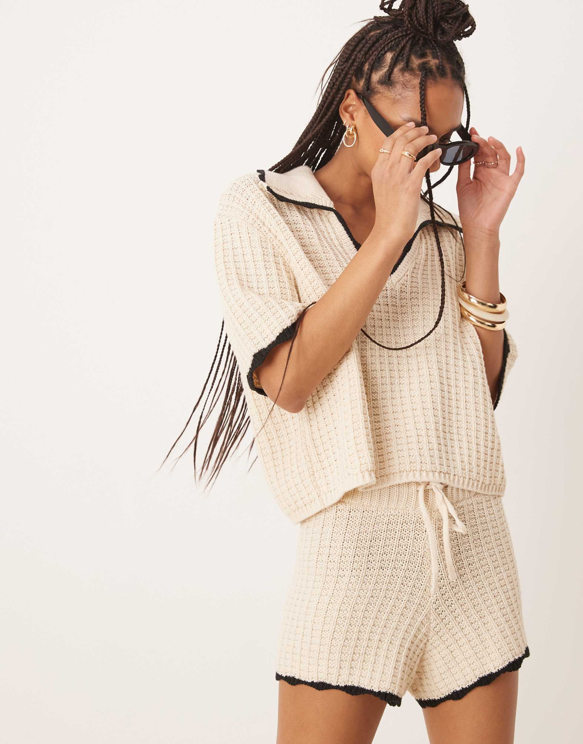 Chunky knit fabric and a relaxed fit define this matte stone polo shirt from ASOS DESIGN, featuring a classic polo collar with a V-neckline and half sleeves. The hip-length silhouette and contrast tipping detail add subtle style to a comfortable everyday essential. Perfect for casual outings, loungewear days, or relaxed everyday wear, this knit polo blends comfort with understated sophistication.
