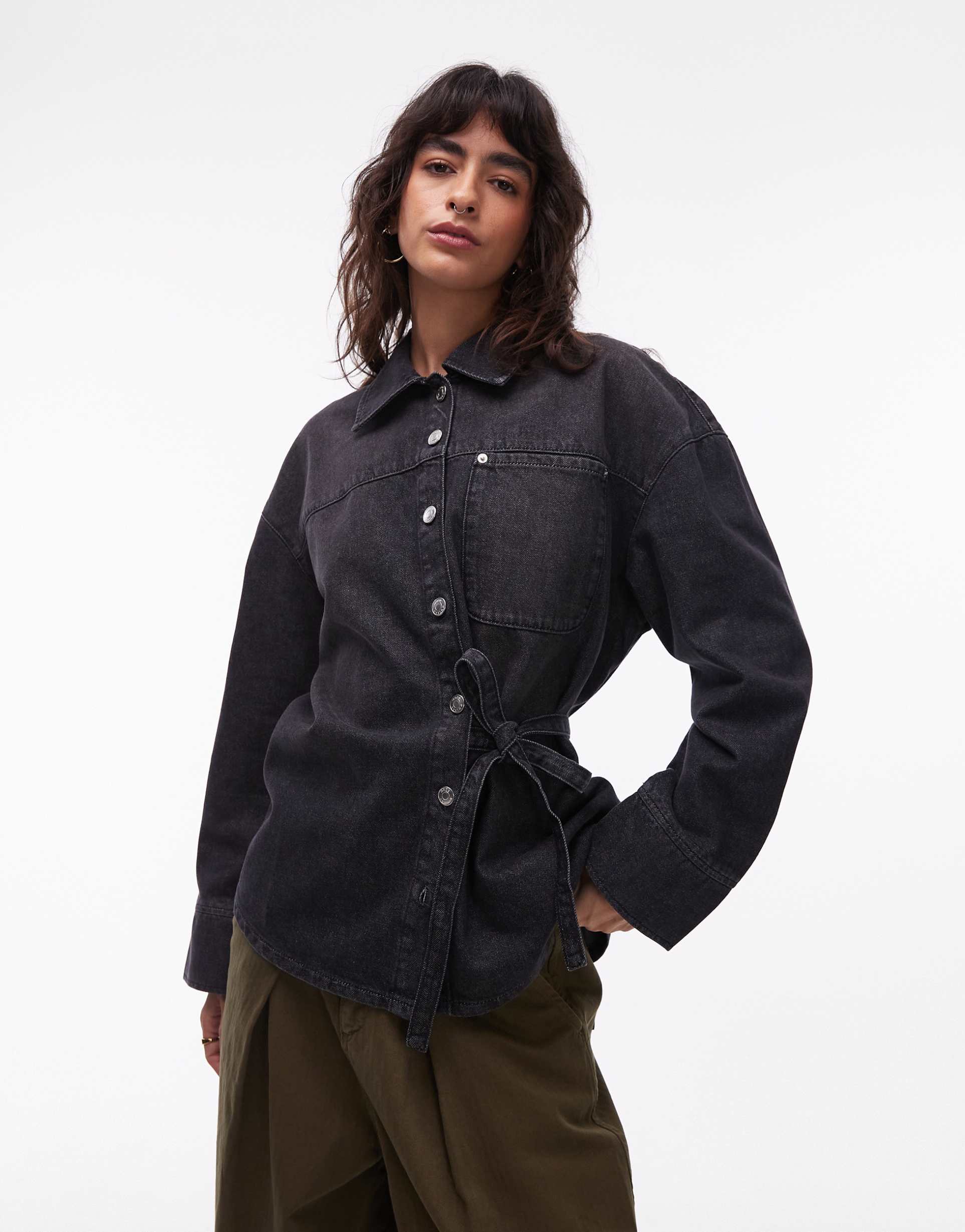 Washed black cotton denim meets an oversized shacket silhouette with a point collar and long regular sleeves for a modern, casual chic vibe. Featuring a button placket and a tie closure at the waist, this hip length shirt offers an adjustable fit that balances structure and ease. The curved hem adds subtle design interest, making it a versatile piece perfect for casual days, streetwear looks, or relaxed workwear settings across all seasons.