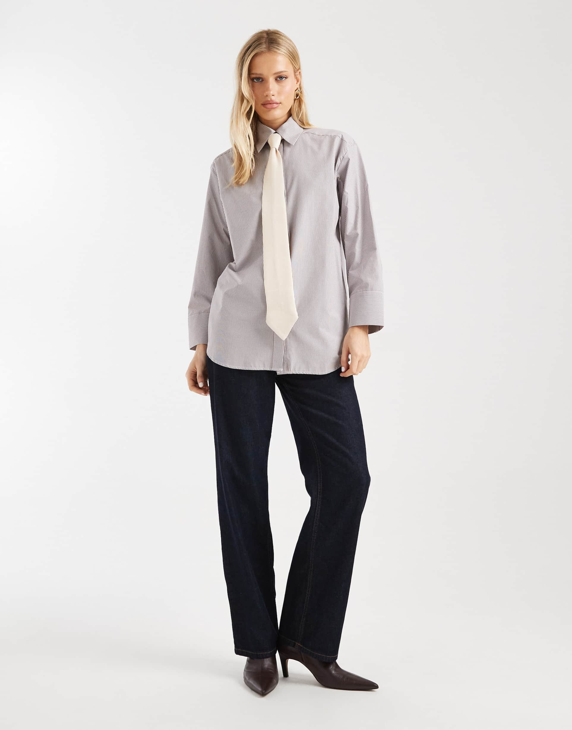 ASOS DESIGN OVERSIZED SHOULDER PADS SHIRT WITH SATIN NECKTIE IN BROWN STRIPES