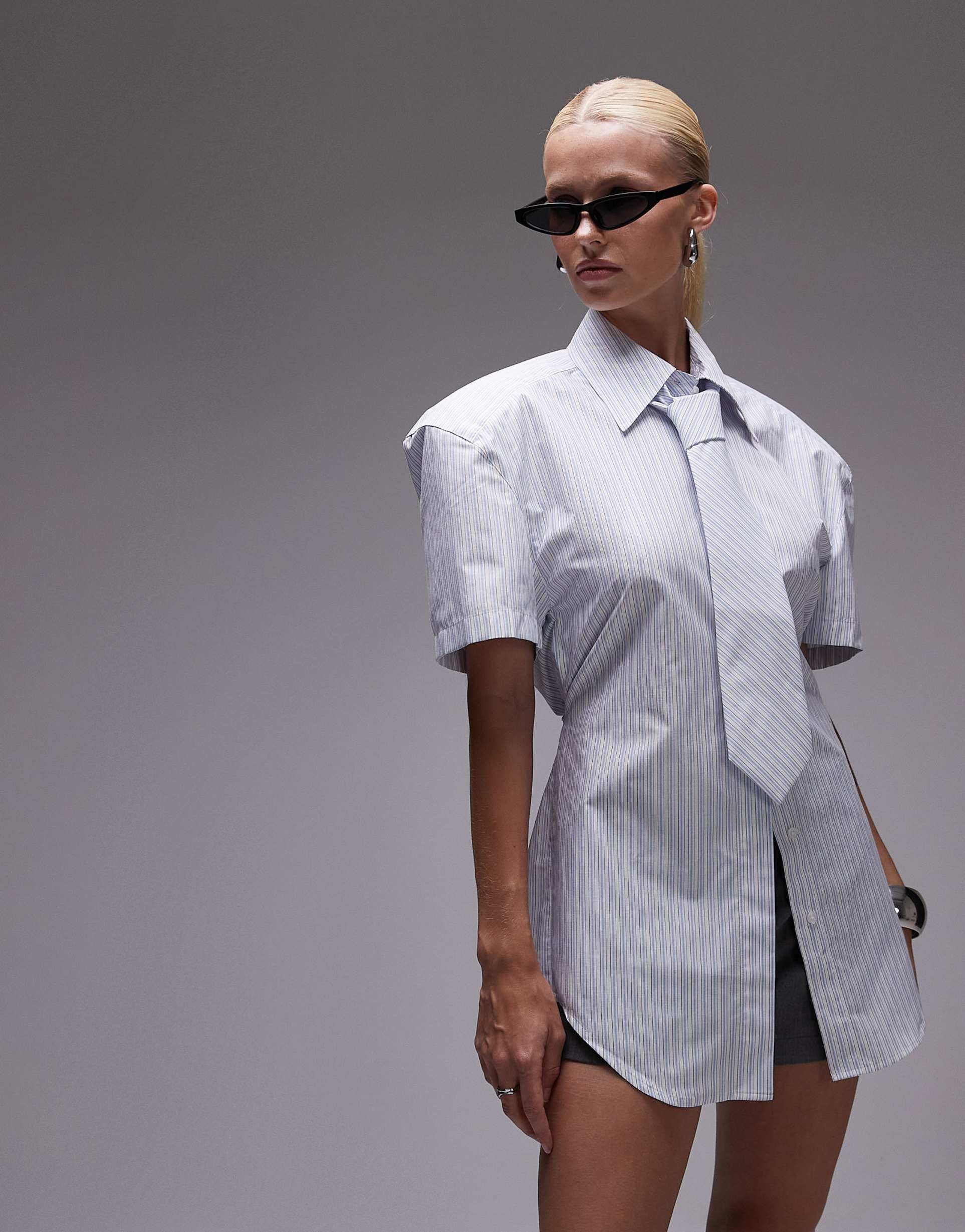 ASOS DESIGN SHOULDER PAD SHORT SLEEVE SHIRT WITH TIE IN STRIPE