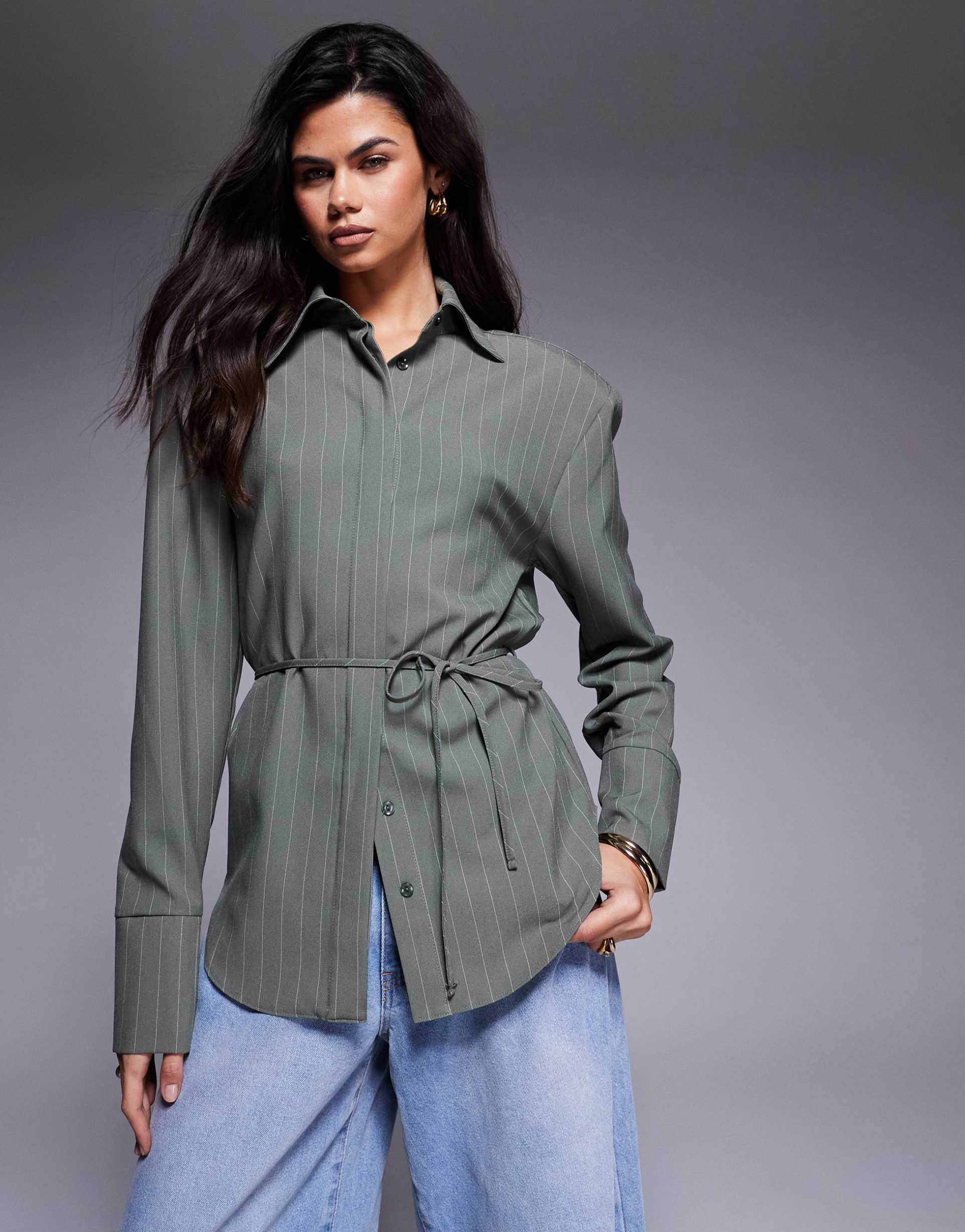 Structured with a modern classic vibe, this hip-length shirt features a matte green pinstripe pattern all over its plain-woven polyester-viscose fabric. Long regular sleeves complement the spread collar and shoulder pads, while a concealed button placket and a tie-back waist add subtle detailing. Its regular fit and versatile design make it ideal for casual days, workwear, and business casual settings, offering both style and comfort in all-weather wear.