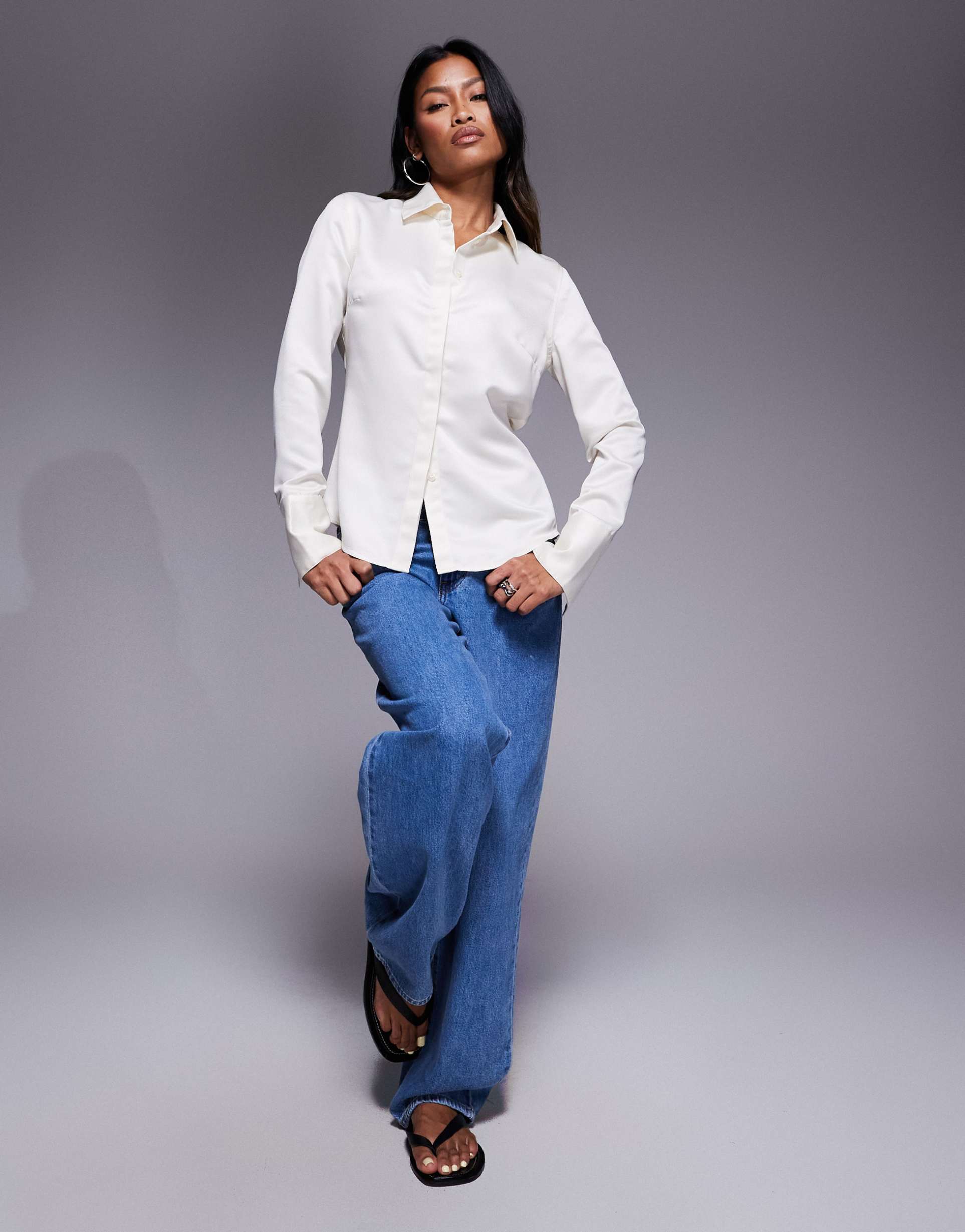 Crisp matte off-white cotton satin fabric defines this slim fitted shirt featuring a classic pointed collar and long regular sleeves. Its hip-length silhouette and neat button placket create a polished, minimalist look perfect for workwear, business casual settings, and everyday wear. The smooth texture and solid color make it an essential staple that pairs effortlessly with jeans or tailored trousers for versatile styling across seasons.