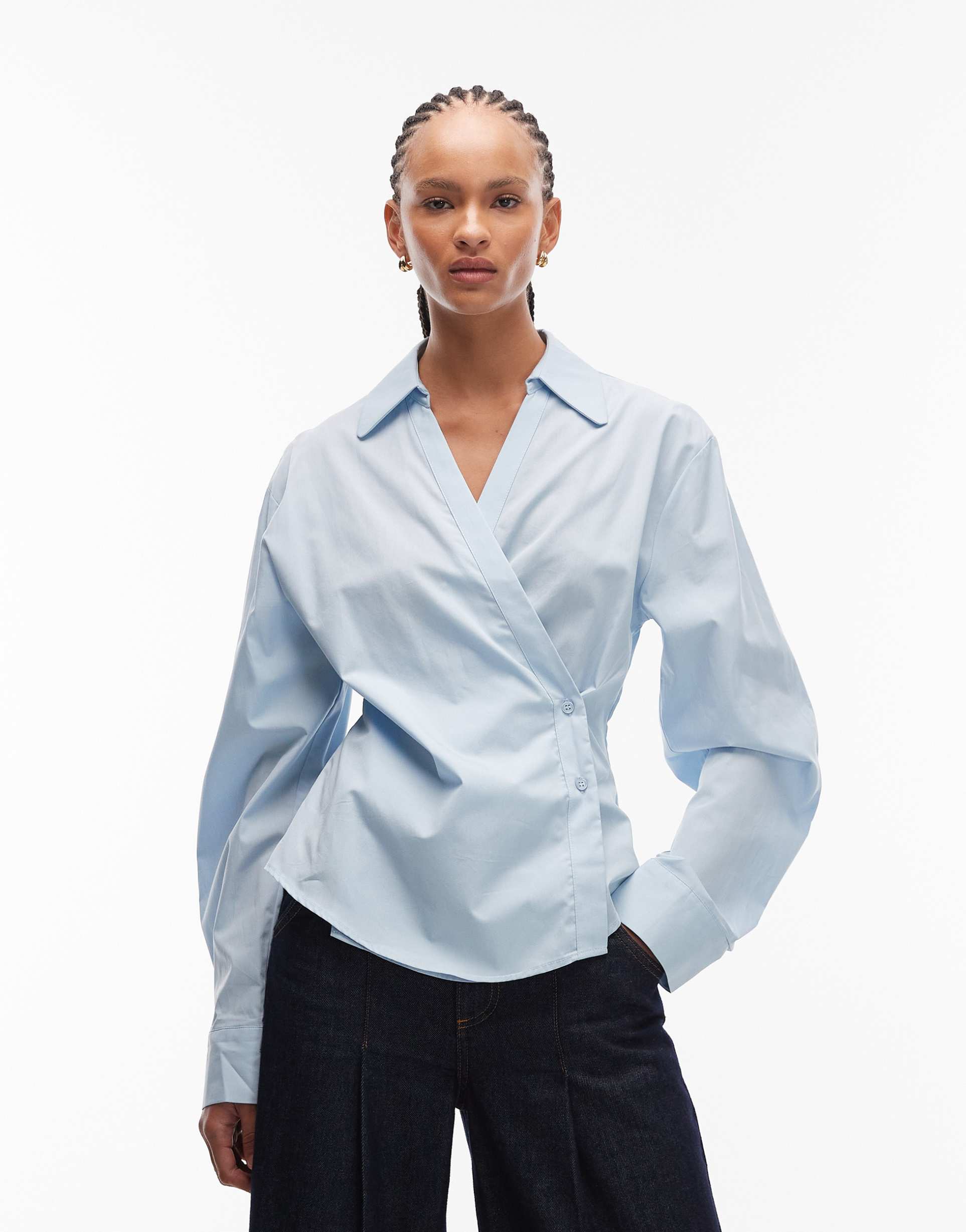 Soft matte light blue cotton fabric forms this classic wrap shirt featuring a spread collar and button placket. Its distinctive cocoon long sleeves add a modern silhouette that balances volume with a regular fit and hip-length hem. The versatile woven cotton construction makes it ideal for workwear, business casual events, and relaxed brunches. This timeless piece blends minimalist style with business chic appeal, ensuring effortless polish from spring through autumn and beyond.