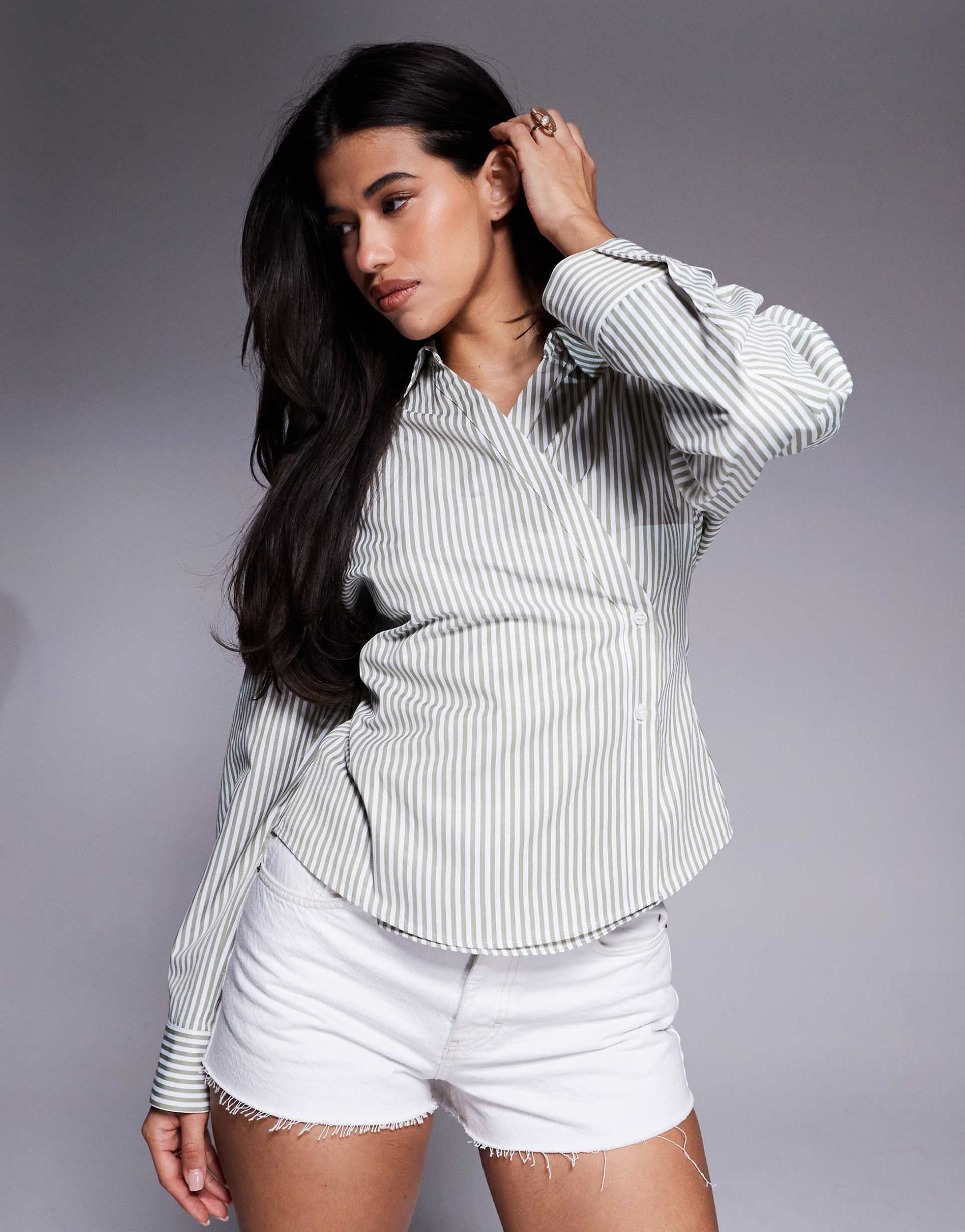 ASOS DESIGN WRAP SHIRT WITH COCOON SLEEVES IN GREEN STRIPE
