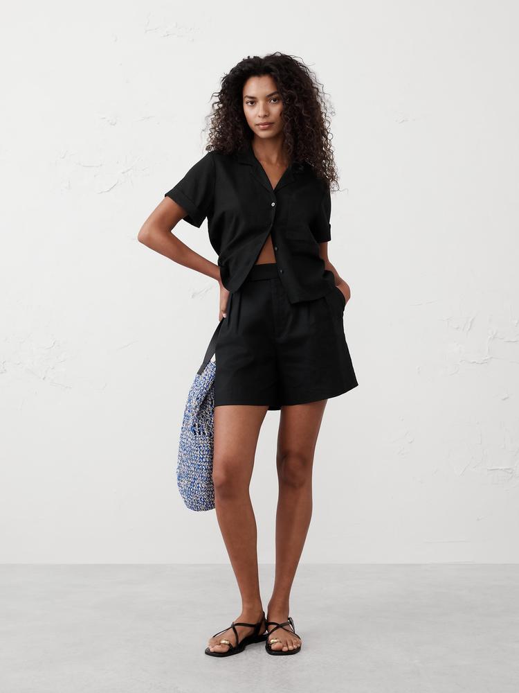 Embrace effortless style with our Linen-Blend Shirt, perfect for sunny days and casual outings. Crafted from breathable linen, this short-sleeved button-up features a classic collar and a relaxed fit, keeping you cool and chic. The subtle navy stripes add a touch of modern elegance to your ensemble. Wear it tucked into your favorite shorts for a stylish vacation look or pair it with linen pants for the ultimate laid-back vibe. This versatile piece will quickly become a go-to in your warm-weather wardrobe.