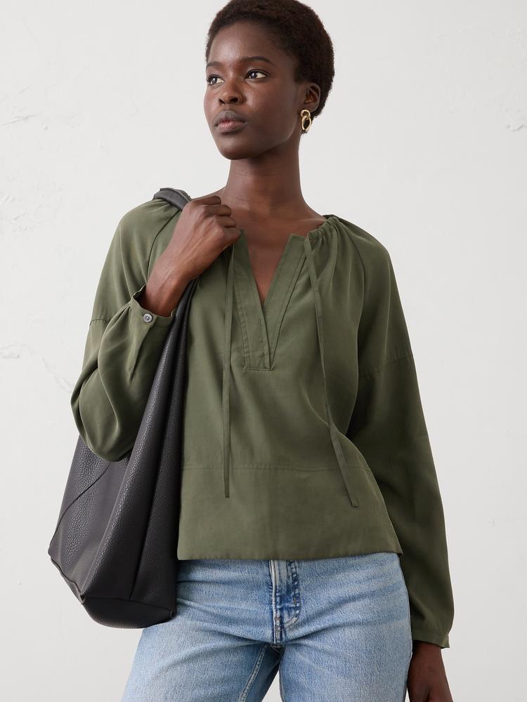 TWILL SHIRRED POPOVER SHIRT