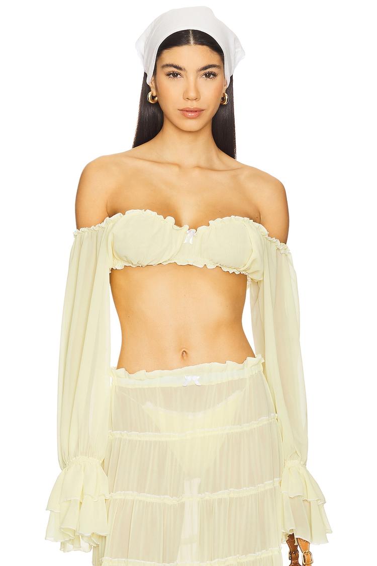 Delicate cream voile with semi-sheer texture and romantic ruffled edges create a dreamy off-shoulder bandeau top. The slim fit and cropped length highlight the silhouette, while the long, billowy off-shoulder sleeves add a bohemian touch. Crafted from lightweight polyester, this pullover top is perfect for casual brunches, beach vacations, and everyday warm-weather wear. Its open back and feminine detailing make it a versatile piece for effortless, chic styling.