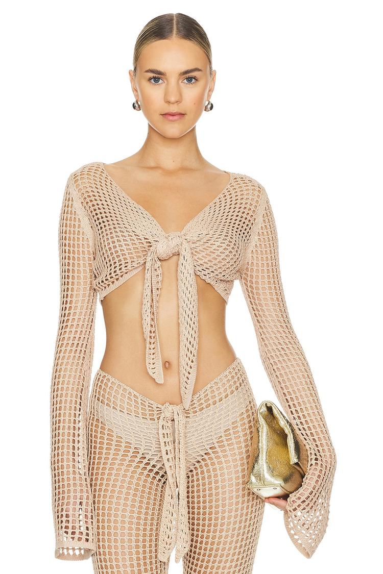 Feel the sun-soaked ease of the Selena Shirt—a lightweight, open-crochet viscose that breathes with every breeze. In a soft beige matte finish, this cropped wrap top features a flattering V-neck and a front tie closure that defines the silhouette. The long, bell sleeves and open-back design bring a romantic, boho-chic vibe, ideal for beach days, brunches, or dressy-casual evenings. Wear it solo over a slip, or layer for chic city looks—its versatile silhouette makes every warm-weather moment effortlessly stylish.