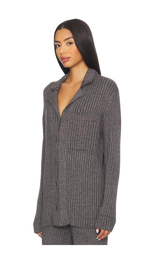 BAREFOOT DREAMS COZYCHIC ULTRA LITE LUREX RIB BUTTON FRONT SHIRT IN CHARCOAL.