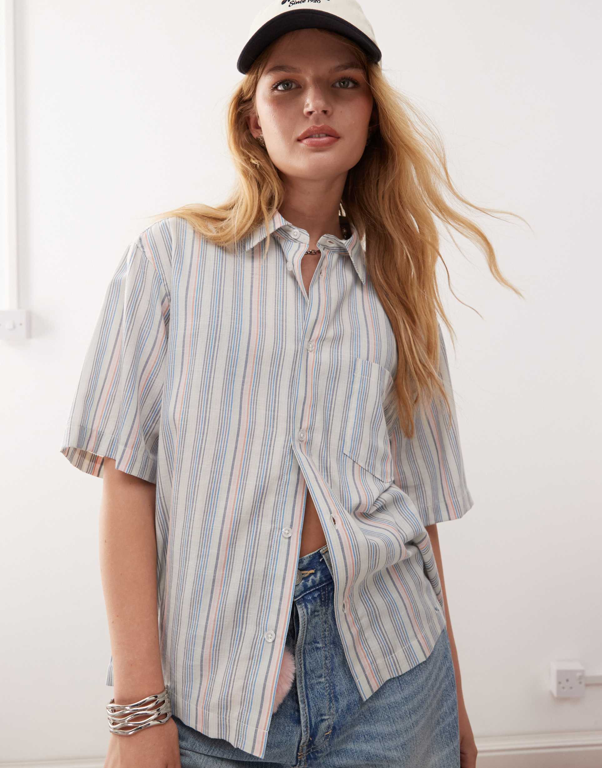 COLLUSION LINEN LOOK OVERSIZED SHIRT IN PINK AND BLUE STRIPE