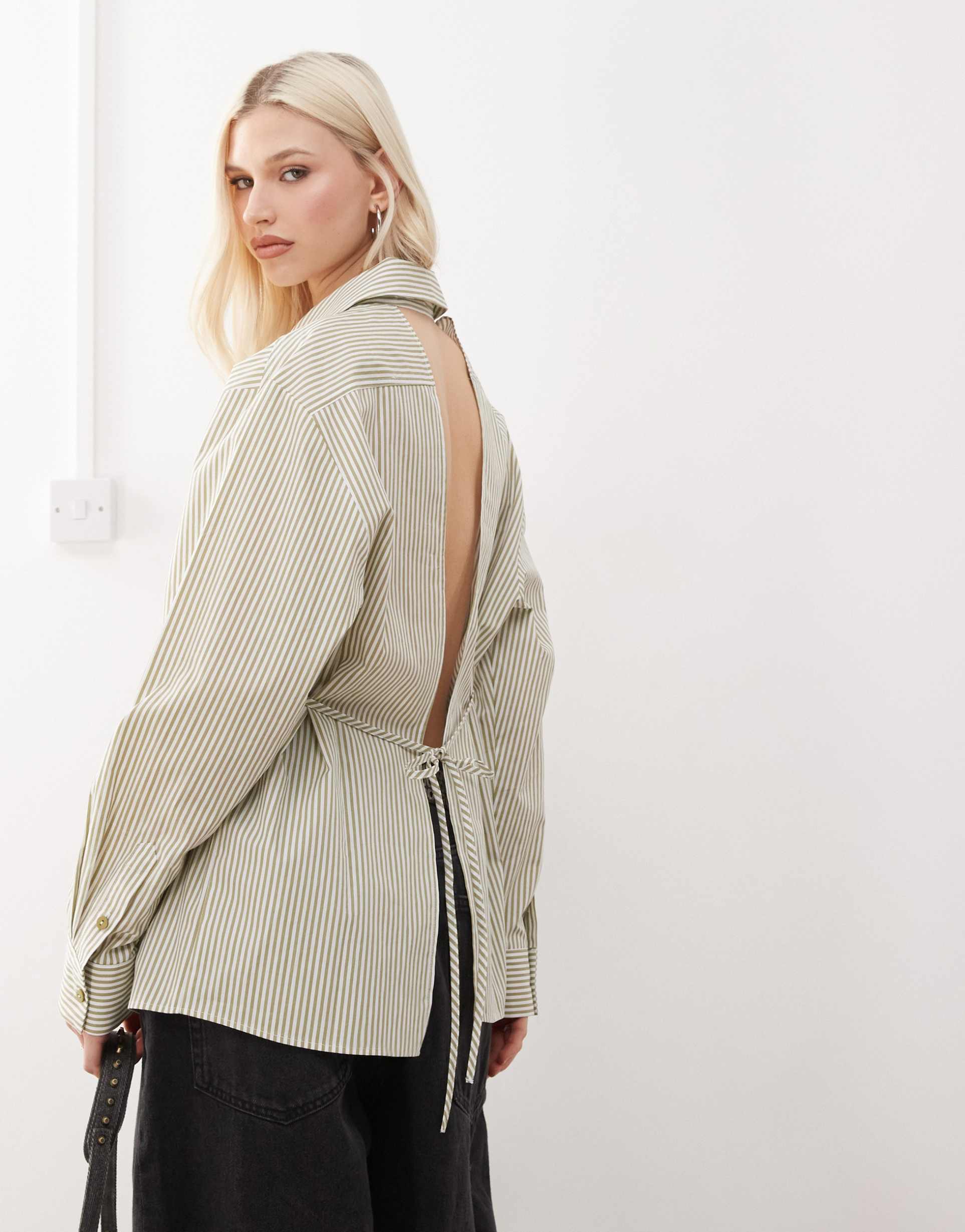 COLLUSION OPEN BACK SHIRT IN GREEN & WHITE STRIPE