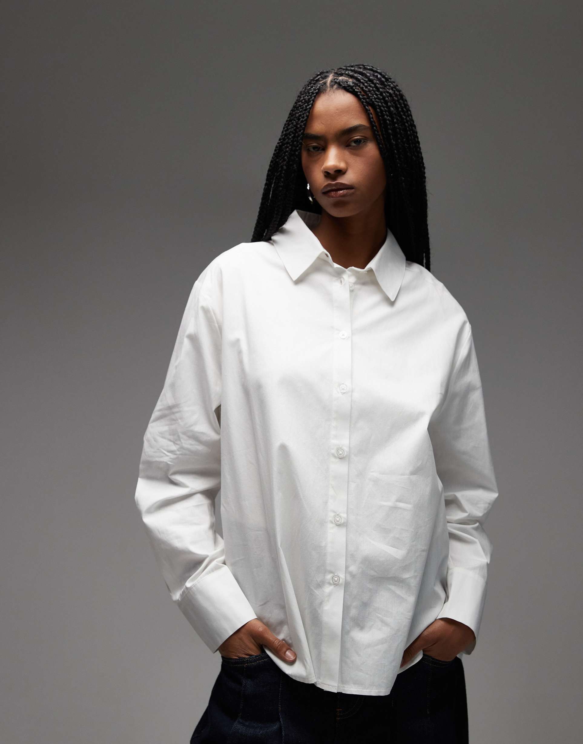 Crisp white cotton and an oversized fit define this classic long-sleeve shirt with a spread collar and button-front closure. Its minimalist design and hip-length silhouette make it a versatile staple perfect for casual days, workwear, and business casual settings. The clean lines and plain-woven texture offer a polished yet relaxed look suitable year-round, making it an essential piece for your wardrobe.