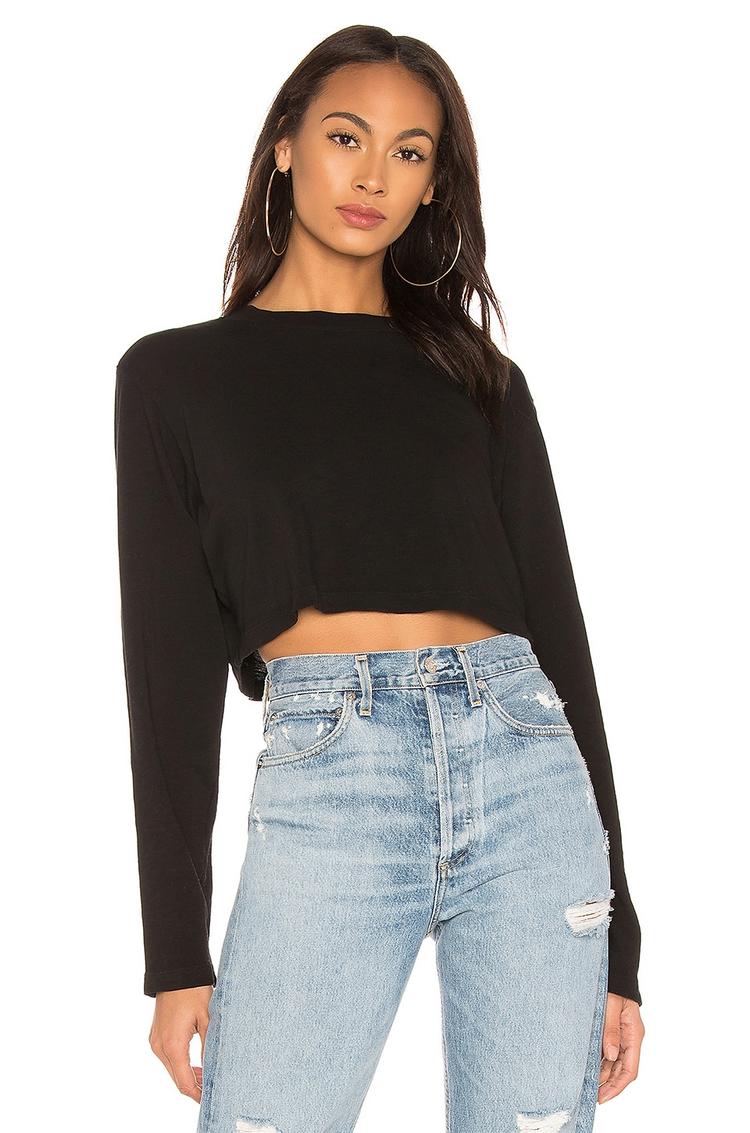 Soft slub knit cotton in a matte black shade defines this cropped shirt with ribbed trim at the collar, cuffs, and hem for subtle texture contrast. Featuring a classic round neckline and long regular sleeves, its regular fit offers comfortable everyday wear. The clean, minimalist silhouette pairs effortlessly with high-waisted denim or skirts, making it ideal for casual outings, brunch dates, or daily errands. Crafted in the USA, this versatile piece blends laid-back style with refined simplicity.