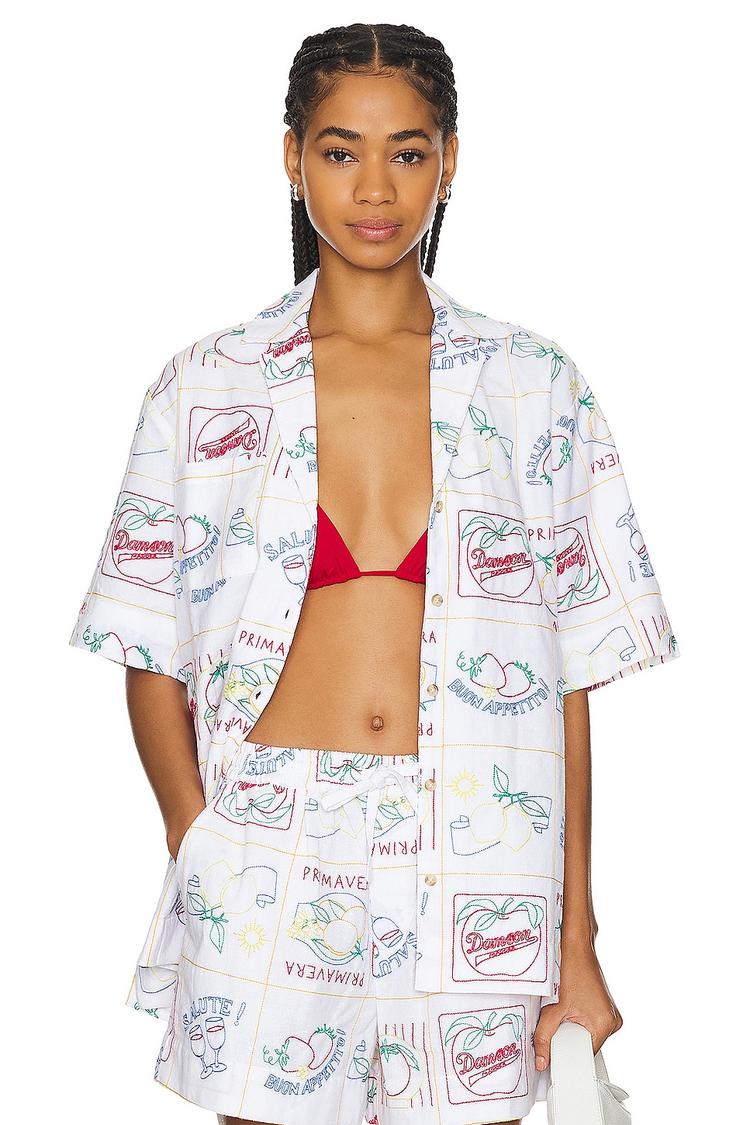 With its relaxed fit and half sleeves, this hip-length shirt is crafted from a breathable blend of organic cotton and linen, offering comfort and style in warmer seasons. The crisp white base is adorned with a playful, multi-color graphic print all over, adding a casual chic vibe. Featuring a classic V-neck and front button closure, this modern shirt is perfect for casual outings, beach days, or vacation wear. Its easygoing silhouette pairs effortlessly with shorts or skirts, making it a versatile choice for everyday wear, brunches, or laid-back get-togethers.