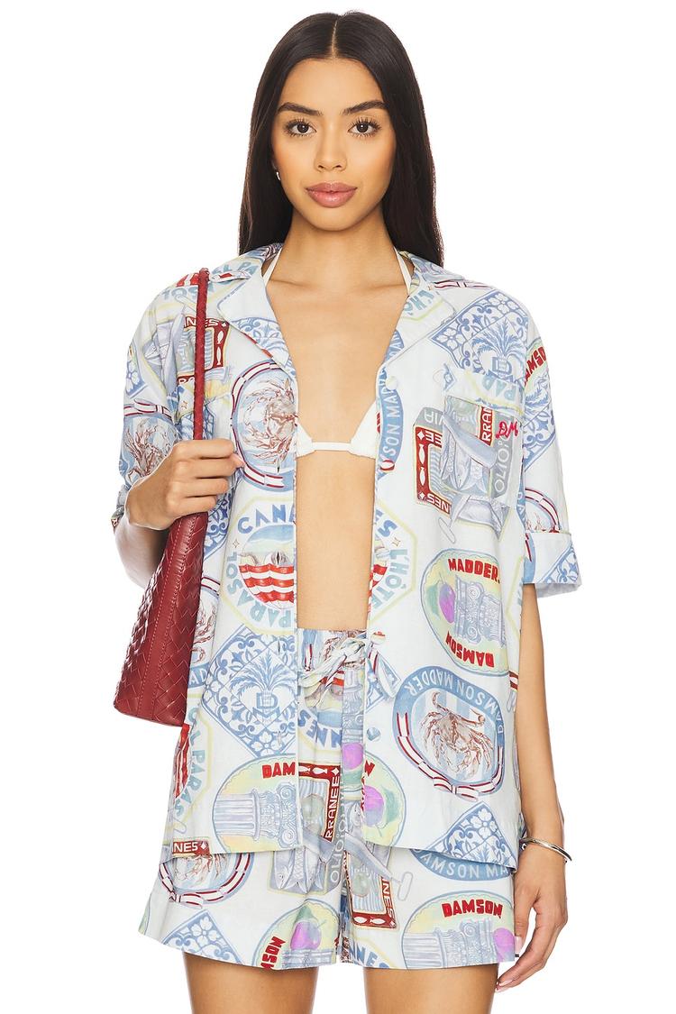 Relaxed and breathable, this hip-length shirt crafted from a midweight blend of organic cotton and linen features a vibrant all-over conversational print in red and blue on a crisp white base. The casual chic silhouette includes a V-neck and half sleeves with a front button closure and a practical breast slip pocket, making it an ideal choice for casual days, brunch outings, or everyday wear during spring through autumn. Its modern style and comfortable fit ensure effortless versatility and timeless appeal.