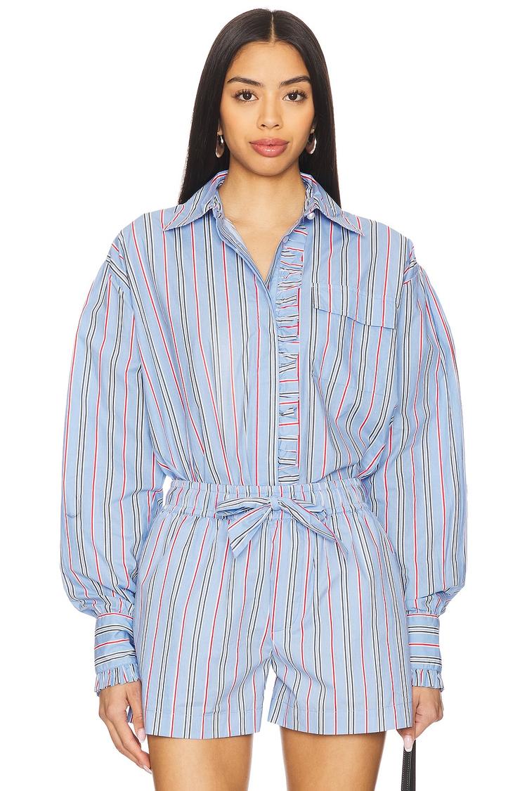 Soft organic cotton and a relaxed fit shape this Kylie Shirt, featuring light blue stripes with red and white accents for a fresh, classic look. The hip-length silhouette is enhanced with long cuffed sleeves, a structured collar, and delicate ruffled edges along the front button closure. An embroidered logo on the back adds a subtle design detail, while a practical front flap pocket elevates its casual chic appeal. Versatile for casual days, workwear, or weekend brunches, this shirt combines comfort and style with sustainable fabric and thoughtful design.