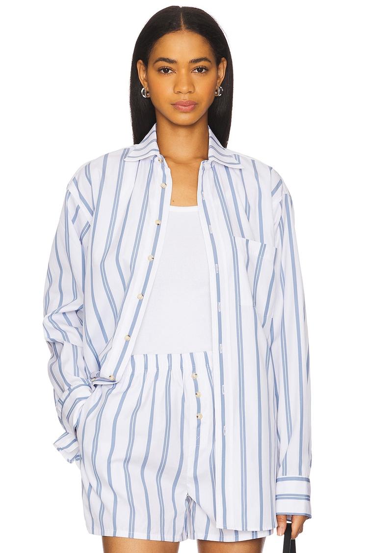 Classic stripes and crisp cotton fabric define this hip-length shirt, designed with a loose fit for ultimate comfort. Featuring a traditional collar and long regular sleeves with button cuffs, it offers a timeless silhouette suitable for casual days, workwear, and business casual settings. The front button closure and breast slip pocket add functional details, while the midweight poplin cotton ensures breathable wear through spring, summer, and autumn seasons. An effortlessly chic piece that pairs well with tailored trousers or relaxed shorts for versatile styling.