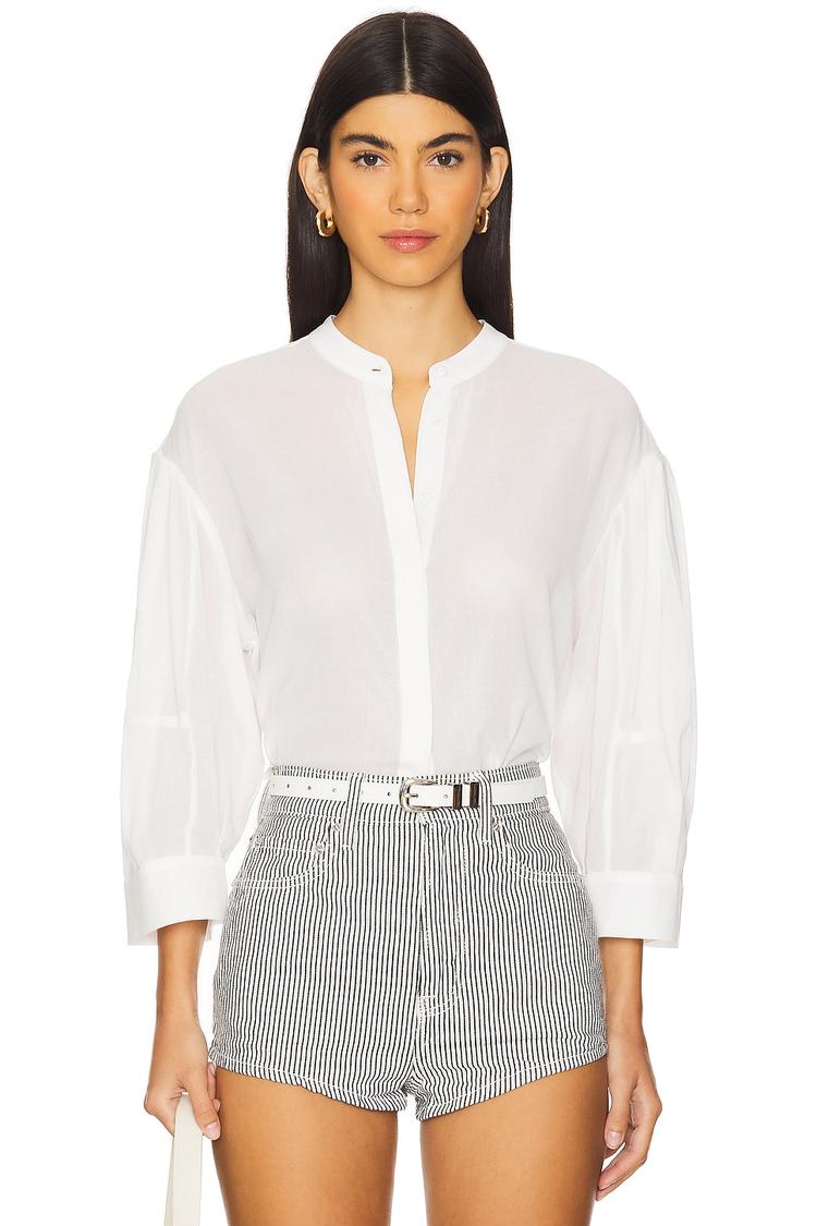 Lightweight 100% cotton poplin forms this modern shirt featuring relaxed fit and hip length hem for comfort and style. The standout balloon sleeves add volume and interest, paired with a neat mandarin collar and buttoned front closure. Its crisp white hue and classic silhouette make it versatile for casual outings, workwear, and brunch occasions. The three-fourth sleeves with buttoned cuffs balance elegance and ease, perfect for spring through autumn wear. This shirt combines timeless appeal with contemporary puff sleeve detail, ideal for a polished yet effortless look.