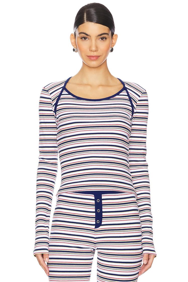 Soft ribbed knit cotton brings comfort and style to this close-fitting shell top, designed with a classic round neck and long regular sleeves. Its hip length and all-over striped pattern in navy, dusty rose, and light gray on a white base create a minimalist yet chic look perfect for casual days, loungewear, and everyday wear. The pullover construction ensures easy wearability, while the breathable jersey fabric makes it suitable for all seasons. A versatile essential that combines relaxed comfort with subtle style.