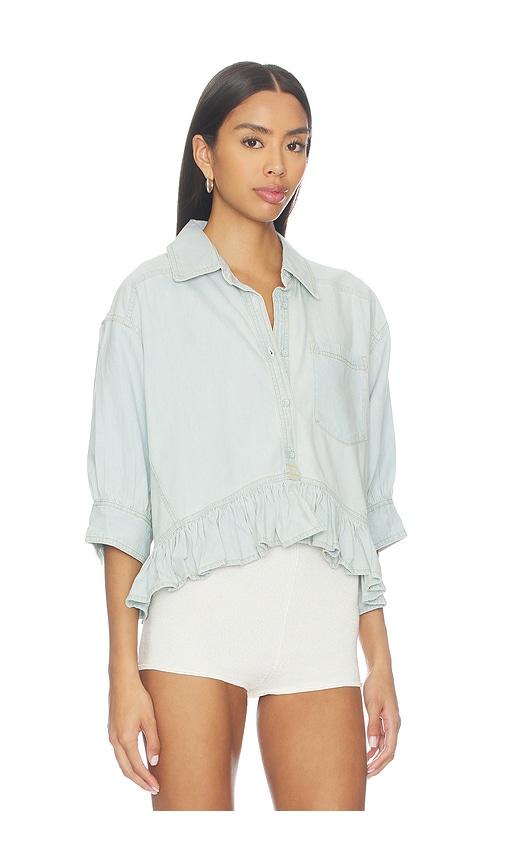 FREE PEOPLE BAILEY DENIM SHIRT IN LIGHT TINT WASH IN BABY BLUE.