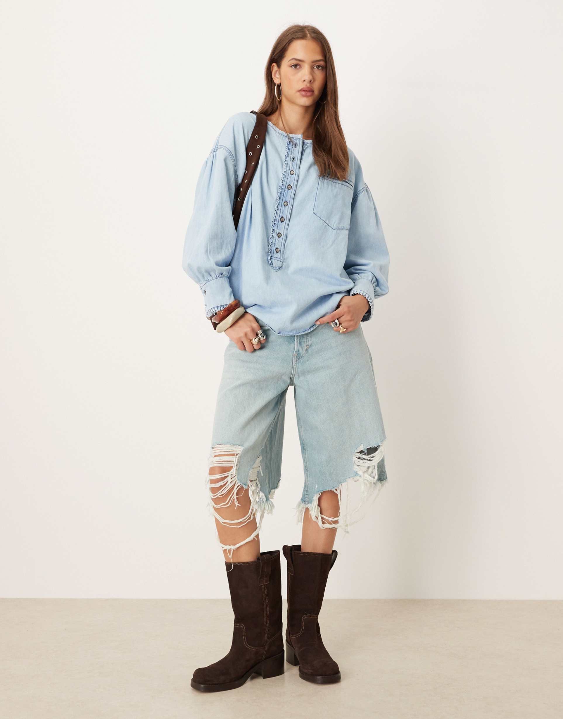 FREE PEOPLE DENIM DREAMING PULLOVER SHIRT IN SOFT LIGHT WASH