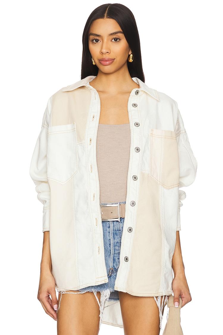 This relaxed-fit shacket crafted from 100% cotton twill offers a cozy, midweight texture perfect for transitional seasons. Featuring a classic collar, long regular sleeves, and front button closure, its thigh-length silhouette is enhanced by two breast slip pockets and subtle beige panels against an off-white base. Ideal for casual outings, everyday wear, and travel, this versatile piece blends modern minimalist style with practical comfort, making it a chic layering option for workwear, business casual, and streetwear looks.