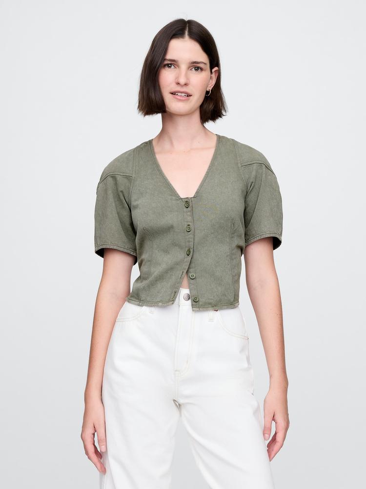 Matte olive cropped denim shirt featuring a V-neck and puffed half sleeves for a flattering silhouette. Its regular fit and button closure add casual ease, making it ideal for spring through autumn wear. Perfectly paired with high-waisted pants, this minimalist piece suits casual outings, brunch dates, and everyday activities with effortless style.