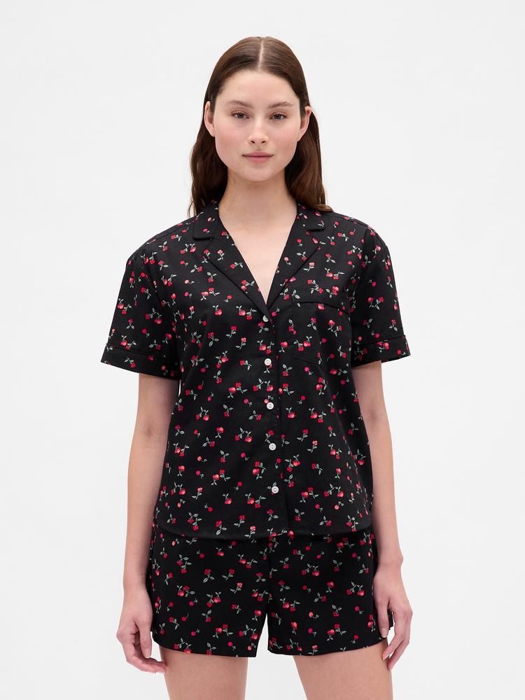 Relaxed and comfortable, this matte black poplin set features a floral print in red, blue, and white all over. The mini length shorts pair perfectly with the half-sleeve V-neck top that buttons down the front, offering casual chic style for lounging or sleepwear. Crafted from crisp cotton poplin, it ensures breathability and easy wear throughout all seasons. Ideal for restful nights, casual weekends, or relaxed days at home, this set balances effortless style with comfortable fabric and fit.