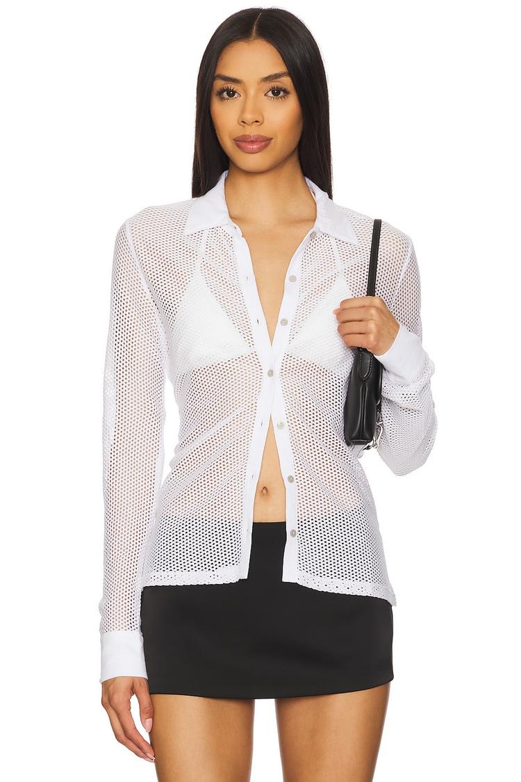 This lightweight, slim-fit white shirt showcases an open-knit fishnet design crafted from 100% pima cotton, offering breathable comfort and a sheer, modern silhouette. Featuring a classic collar, long regular sleeves, and front button closure, its hip-length cut adds versatility for casual wear, street style, or brunch outings. The minimalist aesthetic and sheer fabric make it ideal for layering, bringing a fresh, contemporary vibe to your wardrobe. Perfect for spring and summer, this piece transitions effortlessly from day to night occasions.