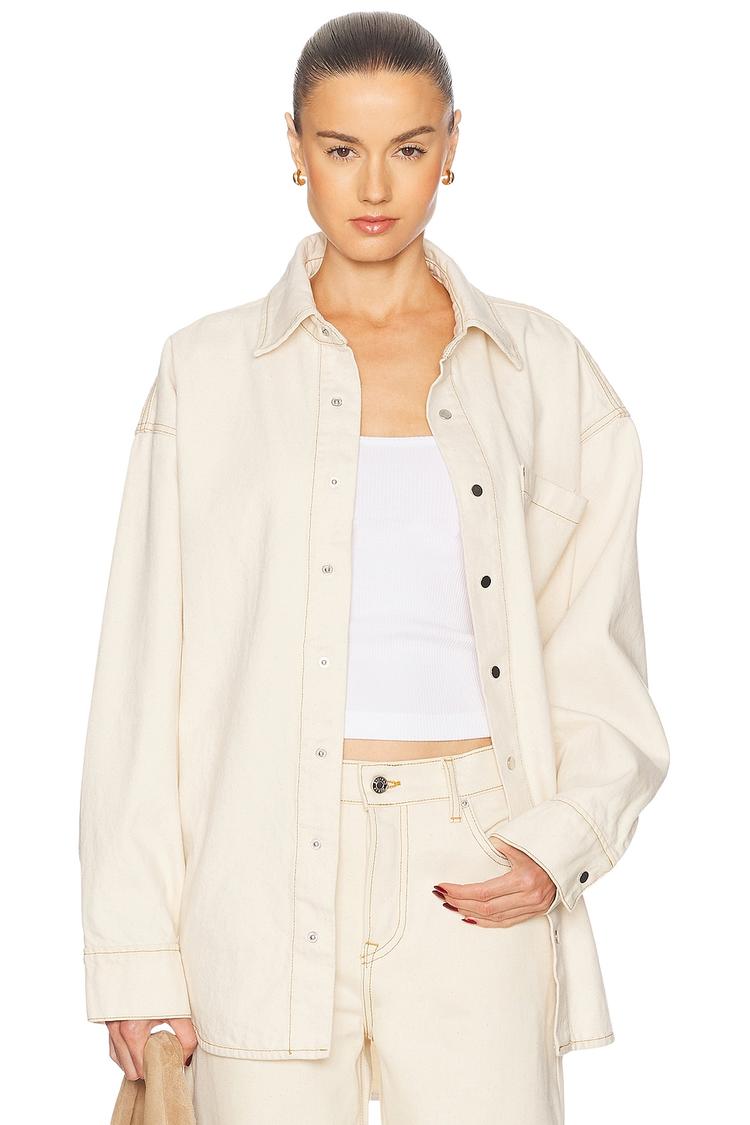 This off-white denim shacket features a relaxed fit with long regular sleeves and a classic collar. Designed with front snap button closure and a breast patch pocket, it highlights contrast stitching that adds subtle detailing. Its hip-length silhouette makes it a versatile layering piece for casual outings, streetwear looks, and everyday wear. Crafted in durable denim fabric, it offers an effortlessly chic and timeless aesthetic perfect for transitional seasons and all-weather use.