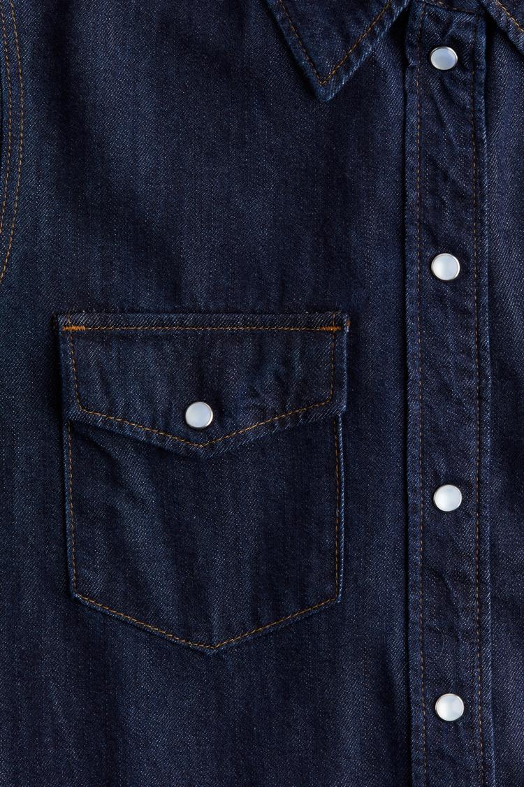 Timeless denim meets practical design in this classic shirt featuring a structured collar, snap fasteners down the front, and patch chest pockets with flaps. Crafted from durable denim fabric, it offers a regular fit with long sleeves and snap cuffs for adjustable comfort. The gently rounded hem and V-shaped yoke at the back add subtle style elements. Perfect for casual days, everyday wear, or business casual settings, this hip-length shirt blends effortless style with versatile wearability.
