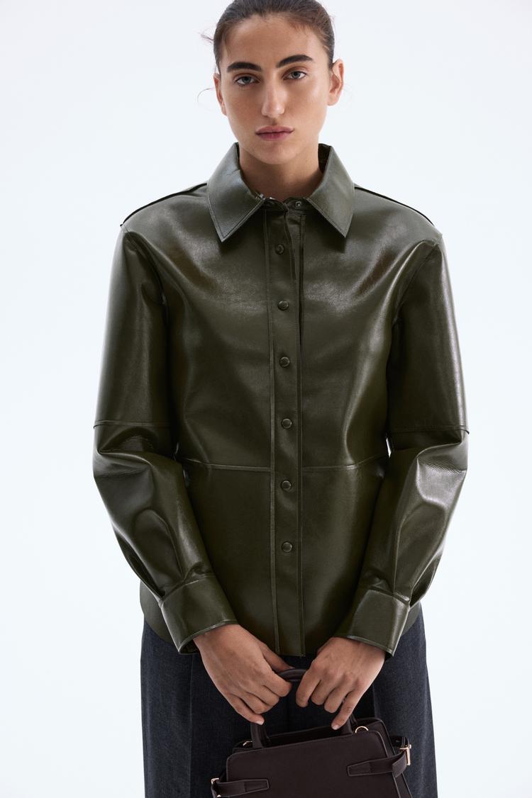 Matte black coated shirt with a sleek, minimal silhouette and a turn-down collar offers a modern twist on classic workwear. Its regular fit and long sleeves provide comfortable coverage, while the hip-length hem adds a versatile touch suitable for casual, business casual, and travel occasions. Button-down closure enhances the timeless design, making it a chic layering piece for autumn, winter, and spring wardrobes.
