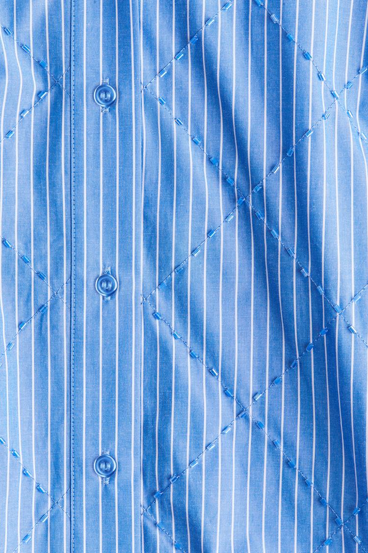 Crisp cotton fabric with an embroidered diamond pattern adorned with bugle beads elevates this relaxed fit shirt. Featuring a classic collar, long regular sleeves with wide cuffs, and a double-layered yoke with pleats at the back, it offers a timeless silhouette with dropped shoulders and a rounded hem. The matte blue hue enhances its minimalist yet elegant style, making it an ideal choice for casual days, workwear, or business casual settings. This hip-length shirt blends comfort with refined detailing for versatile, everyday sophistication.