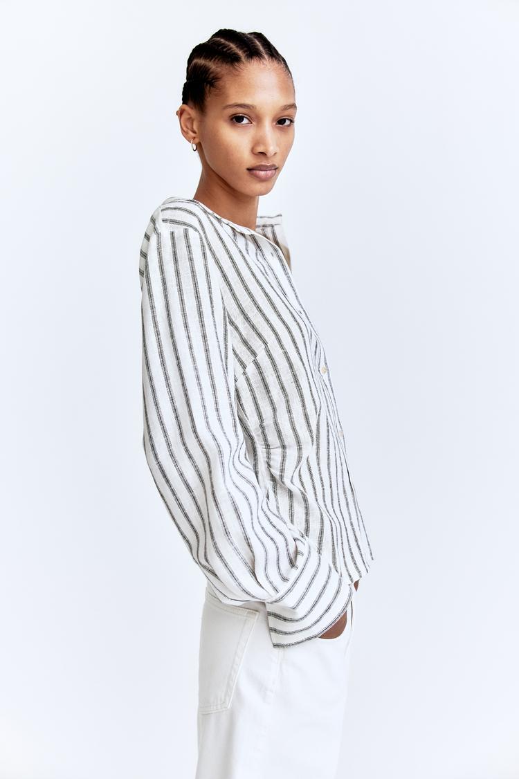 Fitted shirt in an airy weave made from a linen and viscose blend. Features a collar, buttons down the front, a yoke at the back and a patch chest pocket. Long sleeves with buttoned cuffs. Gathers at the sides to create a gently draped effect.