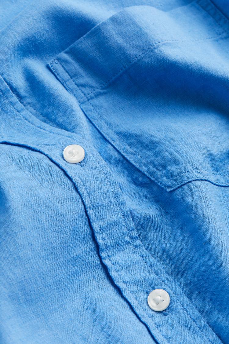 Effortless, breathable daily elegance in a blue linen-blend shirt. A classic collar frames a front button placket, while a convenient chest pocket adds practical charm. Made from airy linen and viscose, it drapes with a soft, light-weight hand and a cool, breathable feel perfect for warm days. The two-layer back yoke with a box pleat creates a relaxed yet polished silhouette, complemented by long sleeves with cuffs and a rounded hem. Dress it up with tailored pants for office chic, or pair with denim for weekend ease—timeless versatility in one wardrobe staple.