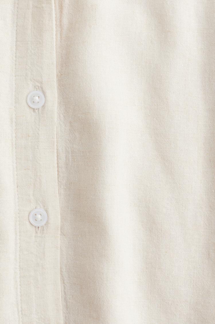 An airy woven linen and viscose blend brings breathable comfort to this loose-fit shirt, featuring a classic collar and elbow-length regular sleeves. The shirt’s hip length with a gently curved hem and heavily dropped shoulders creates a relaxed silhouette ideal for casual, workwear, and business casual settings. A subtle inverted box pleat at the covered back adds elegant detailing, while the front button closure enhances ease of wear. Perfect for spring through autumn, this minimalist beige shirt pairs effortlessly with your favorite trousers or jeans for everyday style.