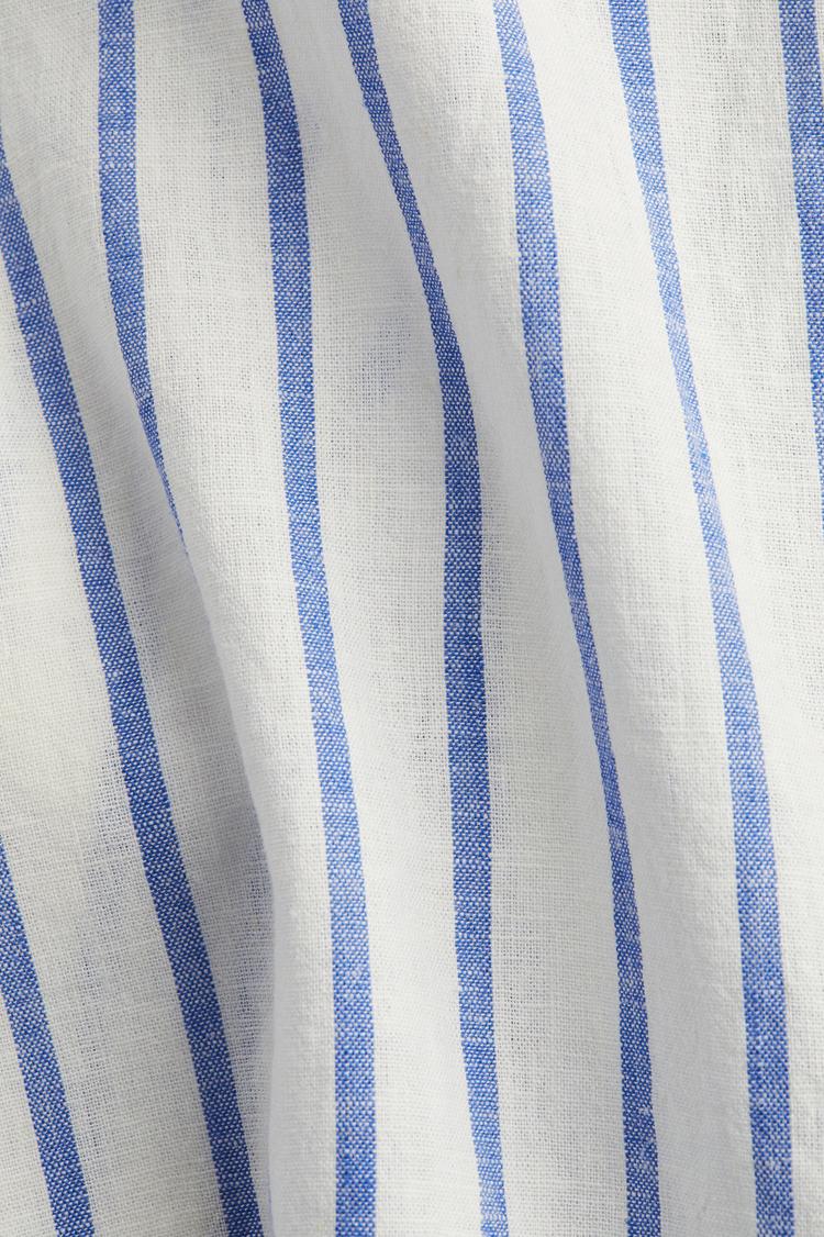 Lightweight linen and viscose blend fabric creates an airy and breathable feel in this classic loose-fit shirt. Featuring a neat collar, front button closure, and an inverted box pleat detail at the back, it offers relaxed elbow-length sleeves and a softly curved hem for a casual chic silhouette. The white base with blue vertical stripes adds timeless style perfect for casual days, workwear, or business casual settings in spring through autumn. Its dropped shoulders enhance comfort while maintaining a polished look for versatile wear.