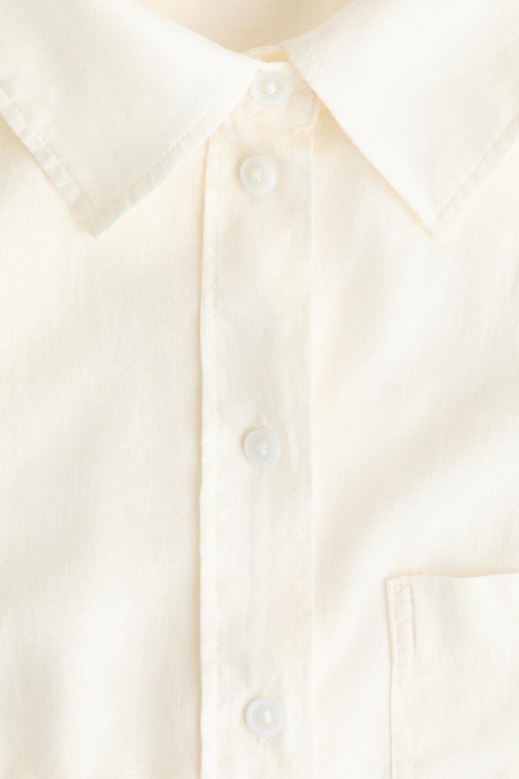 Soft off-white linen blend fabric shapes this relaxed fit shacket featuring a classic collar and long sleeves with button closure. Its hip-length silhouette and minimal design make it a versatile layering piece perfect for casual outings, workwear, or business casual settings. The breathable linen material ensures comfort during spring, summer, and autumn days, while the clean solid color and understated style provide a timeless minimalist aesthetic.