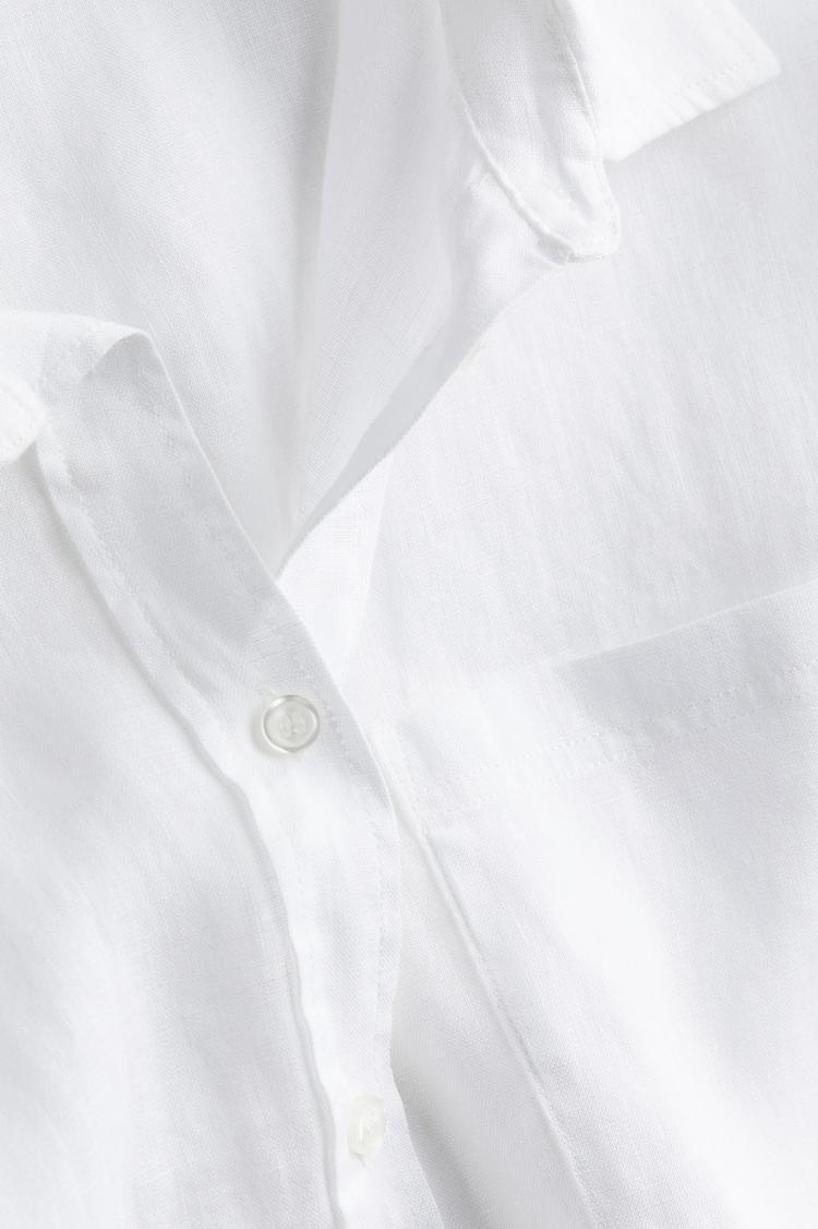 Crisp linen fabric and a relaxed fit define this classic white shirt, perfect for spring to autumn wear. Featuring a traditional collar, long sleeves with buttoned cuffs, and a double-layered yoke at the back, it offers a refined silhouette with gently dropped shoulders and a rounded hem. Ideal for casual days, business casual settings, or brunch outings, this hip-length piece pairs effortlessly with wide-leg trousers or denim. Its breathable linen texture ensures comfort while maintaining a polished, minimalist aesthetic suitable for everyday and travel wardrobes.
