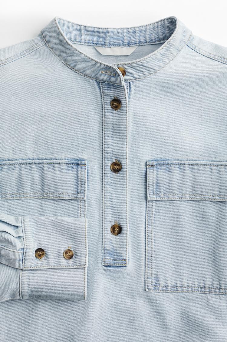 Loose-fit shirt in cotton denim. Band collar, short button placket, chest pockets with flap, and a yoke at back. Dropped shoulders, long sleeves, sleeve placket with decorative link button, and button at cuffs. Slightly longer hem at back.