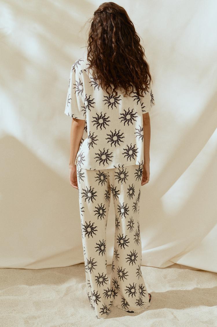 An airy woven blend of linen and viscose defines this loose-fit resort shirt, designed for effortless comfort and style. Featuring a classic collar, front buttons, and elbow-length regular sleeves, it offers a relaxed silhouette perfect for warm seasons. The hip-length hem and all-over abstract black sun motifs on a cream base create a modern yet casual chic vibe. Ideal for casual outings, vacations, or everyday wear, this shirt blends breathable fabric with a contemporary print to elevate your laid-back wardrobe.