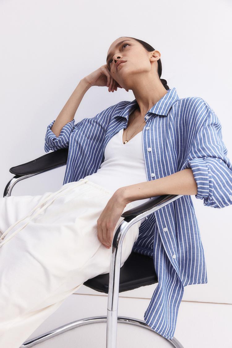 Breezy linen-blend fabric and a relaxed fit define this maternity shirt, designed with a classic collar, long cuffed sleeves, and a front button closure. The blue and white striped pattern runs all over the hip-length silhouette, complemented by a narrow removable tie belt just below the bust for adjustable comfort. The back features a double-layered yoke and gently dropped shoulders, adding to the casual chic vibe. Ideal for spring and summer, this versatile shirt works perfectly for casual outings, everyday wear, or even workwear during and after pregnancy.