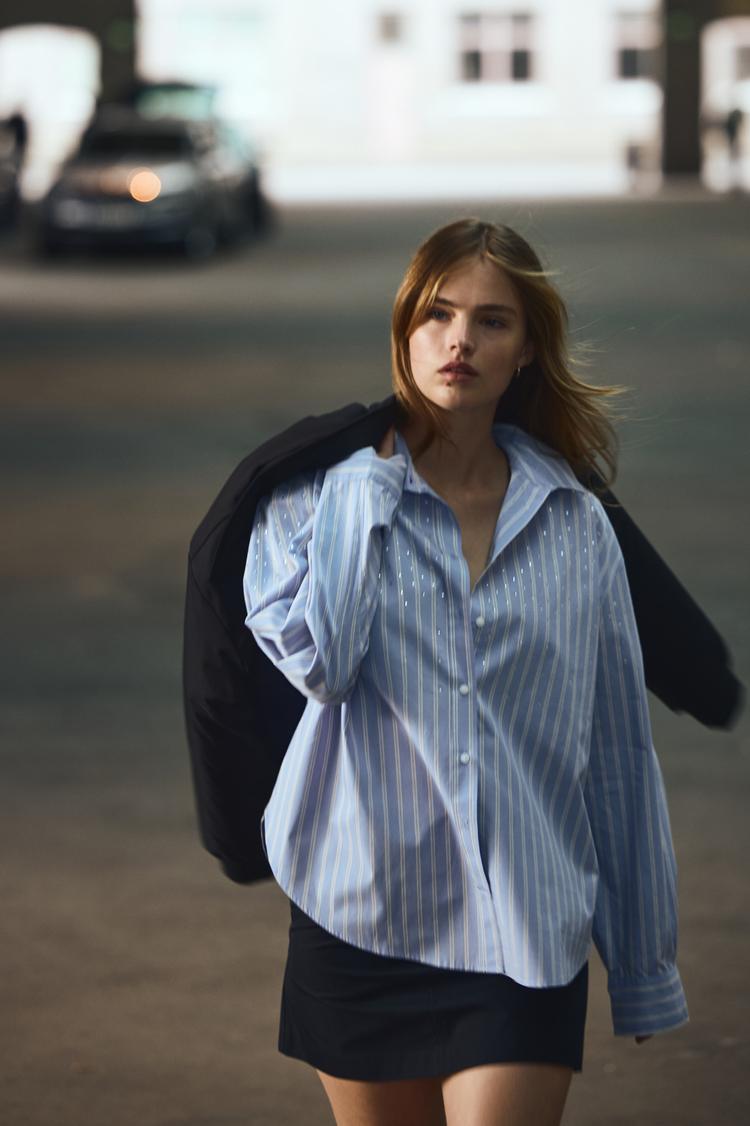Soft cotton fabric and an oversized fit create a relaxed yet polished vibe with this hip-length shirt. Featuring classic pointed collar and long regular sleeves, it is adorned with subtle white stripes and sparkling rhinestone embellishments all over for a touch of understated glam. The front button closure and covered back maintain timeless simplicity, making it versatile for casual outings, workwear, or business casual settings. This light blue striped shirt pairs effortlessly with skirts or pants for a casual chic, minimalist look suitable for spring and autumn seasons.