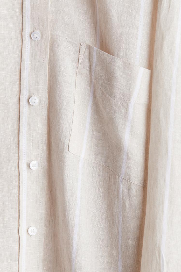 Oversized shirt in airy linen. Collar, buttons at front, yoke at back, and an open chest pocket. Gently dropped shoulders, long sleeves, sleeve placket with link button, and adjustable cuffs with buttons. Straight-cut hem with curved side vents.
