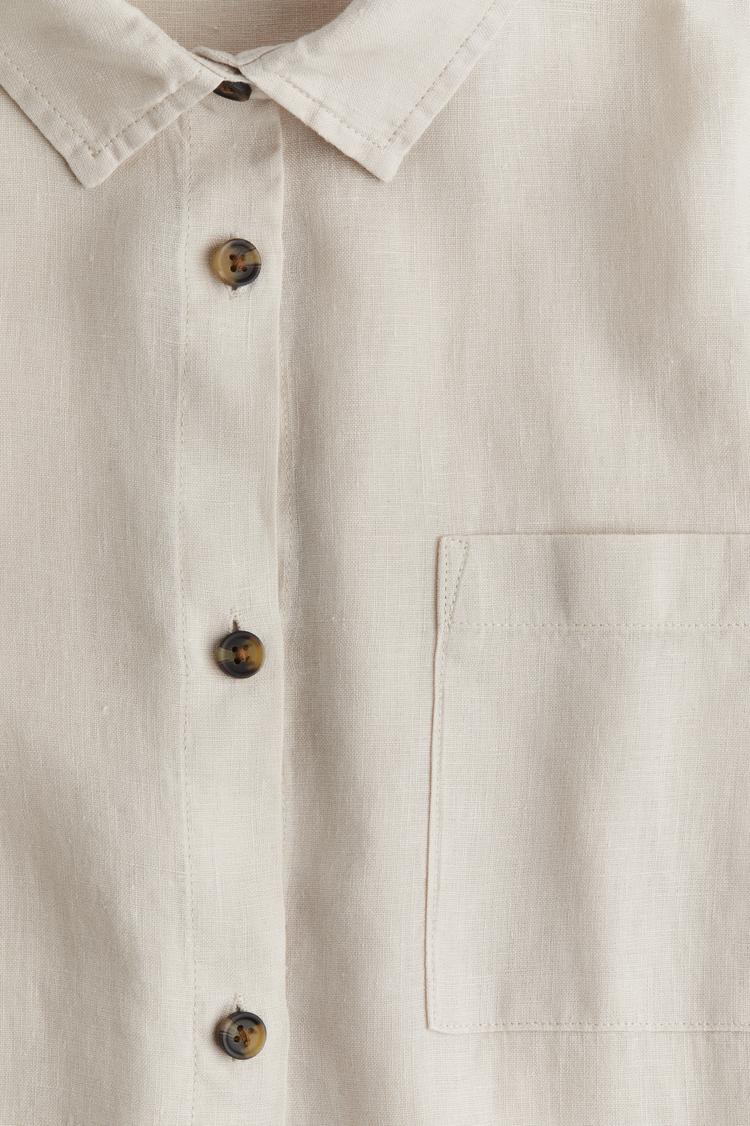 Soft washed linen in a relaxed tunic silhouette offers breathable comfort for sleepwear. This thigh-length nightshirt features a classic pointed collar, long regular sleeves, and a full button front closure. Subtle back pleats enhance ease of movement, while an open chest pocket adds casual utility. The matte beige hue and rounded hem provide a timeless, cozy aesthetic ideal for restful nights and lounging. Perfect for sleepwear, casual homewear, and laid-back travel.