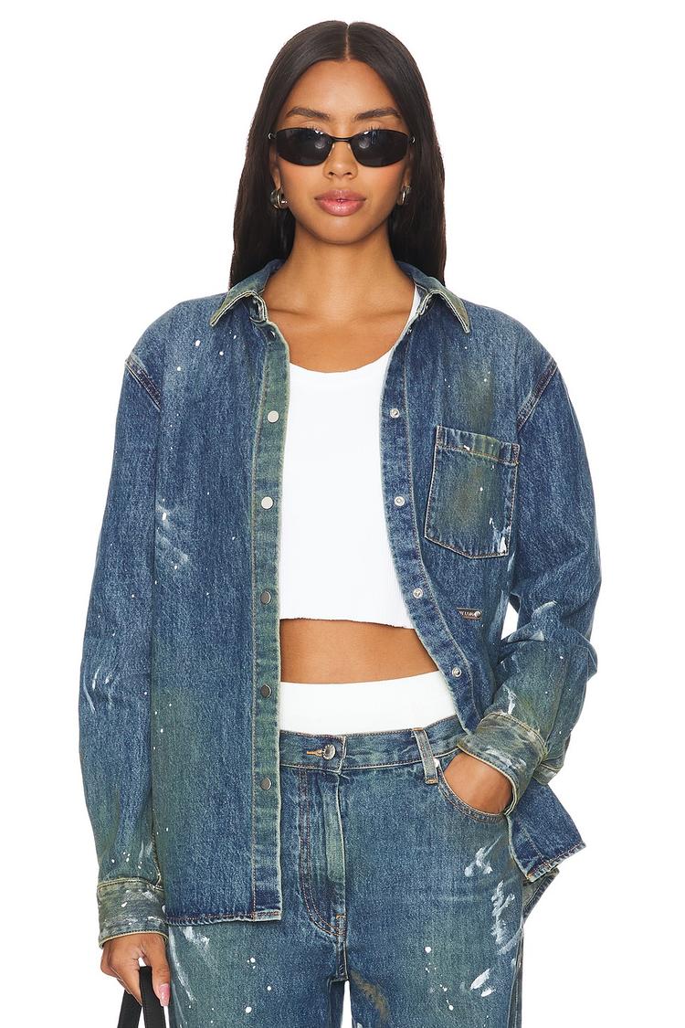Rigid denim crafted into a loose, hip-length shacket features a classic collar and long regular sleeves with buttoned cuffs. The front snap button closure and breast pocket add functional charm, while the subtle paint detail across the fabric introduces an artistic edge. Perfect for casual days, streetwear looks, or travel, this versatile piece blends casual chic and street style aesthetics. Its all-weather suitability and relaxed fit make it an effortless layering essential for transitional seasons and beyond.