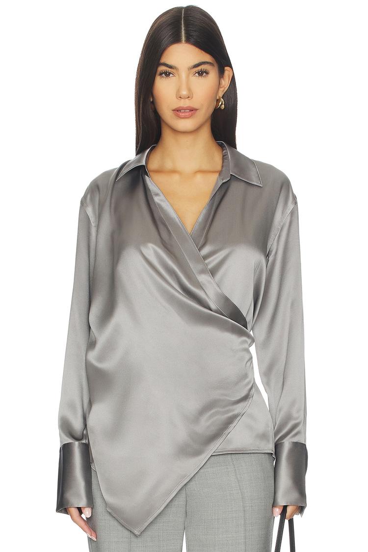 Softly draped in lightweight satin silk, this relaxed-fit wrap shirt features a classic collar and long cuffed sleeves for an elegant silhouette. Its side button closure and hip-length hem create a sophisticated yet effortless look perfect for workwear, business casual, brunch, or an evening date night. The semi-sheer fabric adds subtle allure while maintaining a modern minimalist charm, making it versatile for all seasons and occasions.