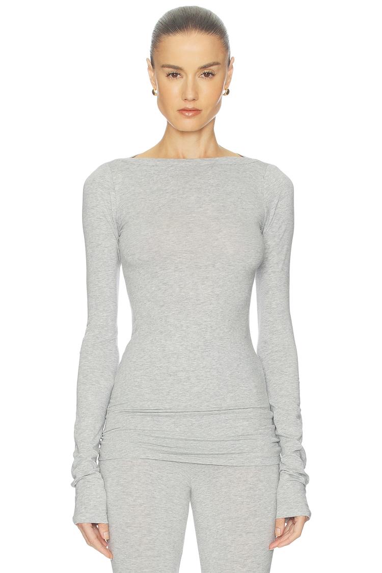 Softly contoured in a lightweight cotton and lyocell blend with a hint of elastane, this close-fitting long-sleeve shirt features a clean straight neckline and extra-long sleeves that extend gracefully past the wrists. Its minimalist silhouette and matte gray tone make it a versatile piece ideal for casual outings, travel days, or relaxed loungewear. The hip-length hem and pullover styling offer effortless comfort and a sleek profile that pairs well with various bottoms for everyday wear.