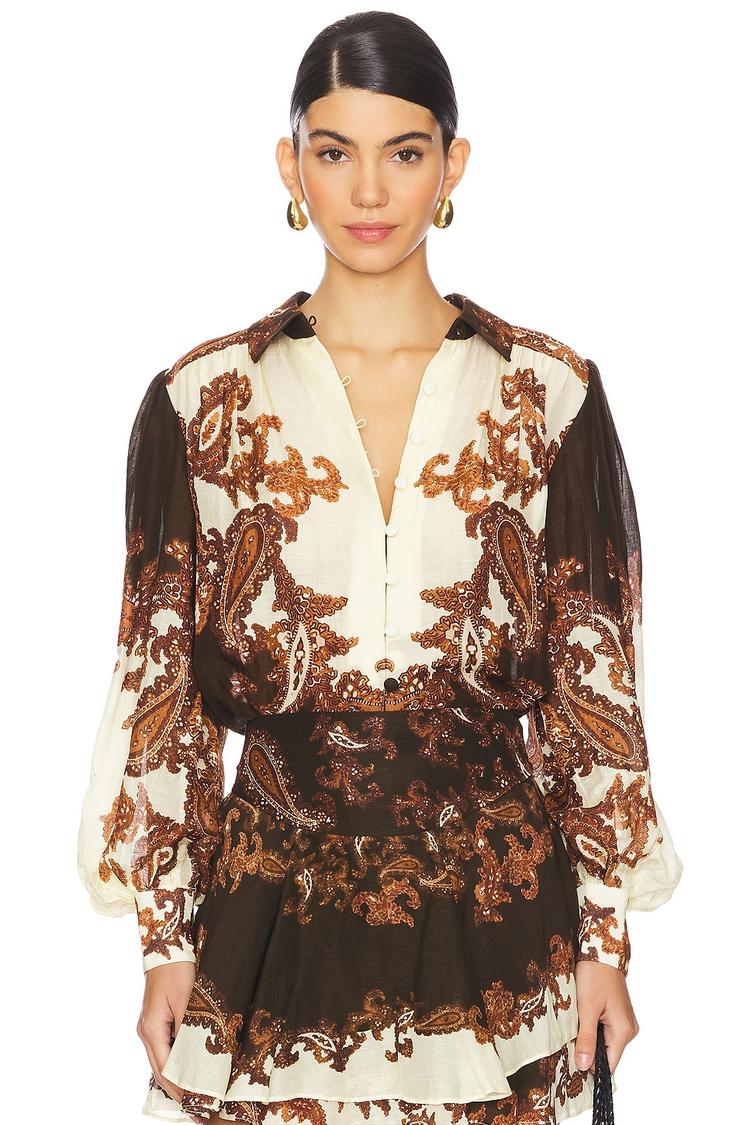 Flowing viscose and linen blend fabric brings a relaxed bohemian charm to this hip-length shirt. Featuring a deep V-neck and voluminous balloon sleeves with buttoned cuffs, the loose fit ensures comfort and breathability. The all-over abstract floral print in earthy black, cream, and brown tones evokes casual chic vibes perfect for brunches, everyday wear, or casual outings. The front button loop closure adds a subtle classic touch to this boho-inspired silhouette, making it a versatile piece for spring through autumn seasons.
